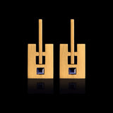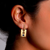 Geometrical designs depicting historic structures are the foundation of the brand – Sacra Mvlier. Rectangular shaped 18K gold earrings with delicate blue sapphire stone reiterate that. This latest piece of ear rings has an edgy matte finish, is stylish and unique in every way.